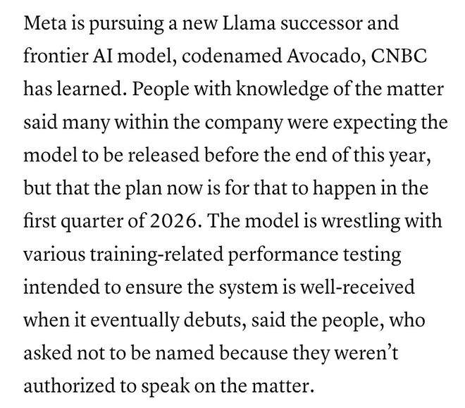 报道还透露,公司内部许多人原以为「Avocado」会在今年年底前发布,但现在的计划已