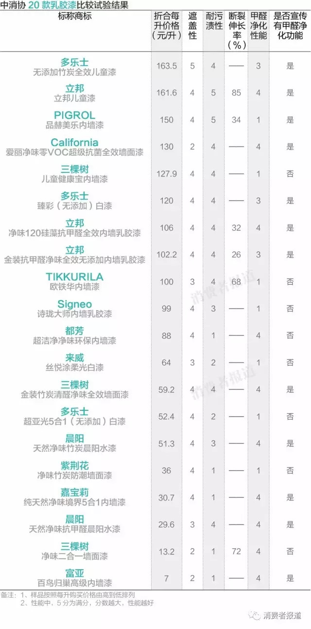 5月4日,中国消费者协会发布了20款乳胶漆比较试验结果,产品涉及多乐士、立邦、嘉宝莉、晨阳、三棵树、都芳、紫荆花、富亚、来威、Signeo(诗珑大师)、PIGROL(品赫美乐)、TIKKURILA(欧铁华)、California(爱丽净)等13个品牌,主要测试了其遮盖性、耐污渍性、耐洗刷性等使用性能。