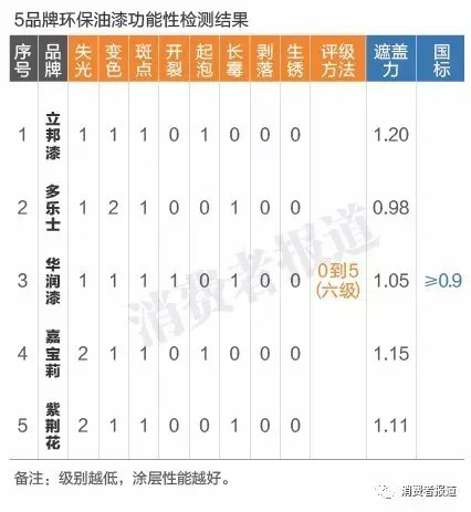 2014年11月,《消费者报道》也曾向第三方权威检测机构送检了多乐士、立邦、华润漆、嘉宝莉、紫荆花漆等5款环保油漆,其中,立邦漆的遮盖力表现最佳达到1.20,多乐士表现略逊达0.98。虽然数据差距不大,但大家可不要少看这零点几的差距。