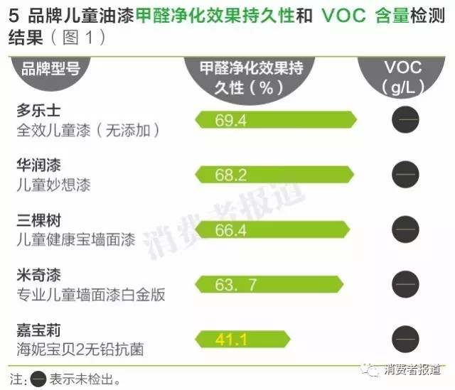 2015 年5 月,消道长也送检多乐士、华润、嘉宝莉、三棵树、米奇漆等5款儿童漆,测试了其甲醛净化效果测试,结果显示多乐士净化效果最高,为69.4%,表现最差的嘉宝莉第2 代儿童漆仅测得41.1%,但这款产品并非主打抗甲醛功能。五款儿童漆都未检出VOC,可以说环保安全性会比环保漆好一点。